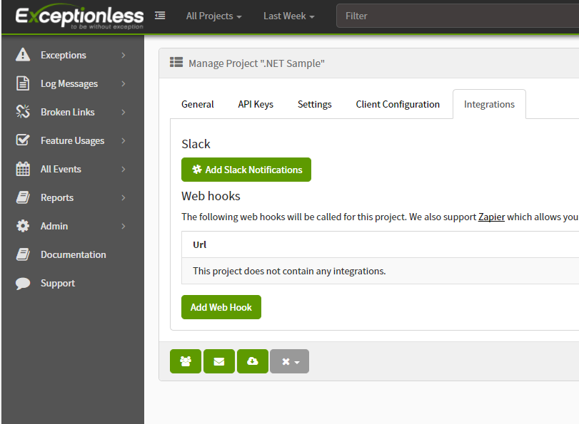 First, go into your project's settings in the Exceptionless app and click on the Integrations tab.